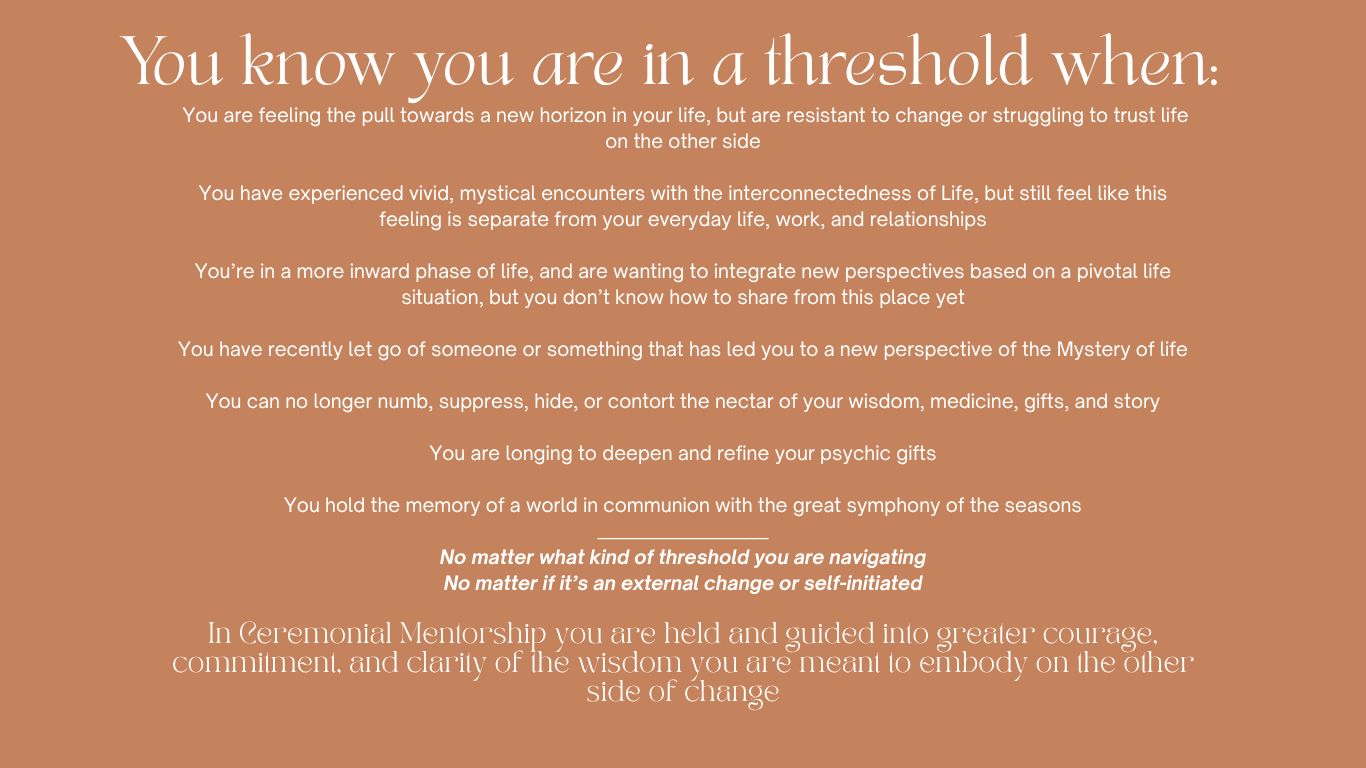 The teachings of the seasons, elements, plants, herbs, and indigenous technologies such as The Medicine Wheel, The Four Directions, Rites of Passage, Earth as The Great Mother, as well as connection to the intelligence of the soma and physical senses are a path to soul-making. Here you will make soul-contact, create intimacy with your deepest longings, shadows, wounds, and investigate your own earthly ancestral lineages.